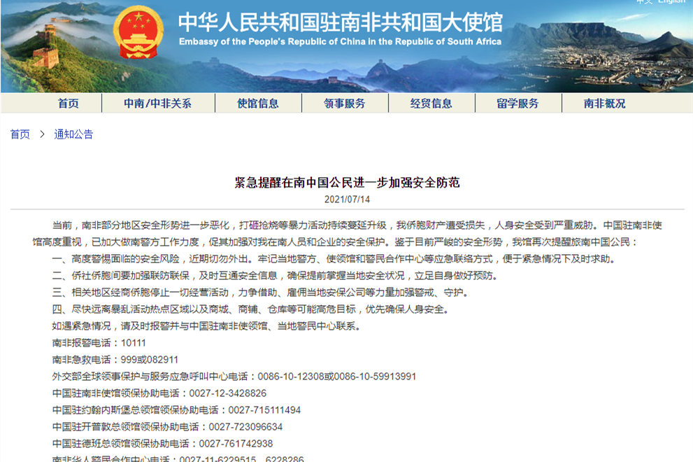 香港中通社7月14日電 中國駐南非大使館網站7月14日發布通知公告指出,南非多省出現騷亂,中國駐南非大使館緊急提醒在南中國公民加強安全防範。 通知公告指,當前,南非部分地區安全形勢進一步惡化,打砸搶燒等暴力活動持續蔓延升級,中國僑胞財產遭受損失,人身安全受到嚴重威脅。中國駐南非使館高度重視,促請當地警方加大工作力度,加強對中國在南人員和企業的安全保護。 鑒於目前嚴峻的安全形勢,中使館再次提醒旅南中國公民高度警...