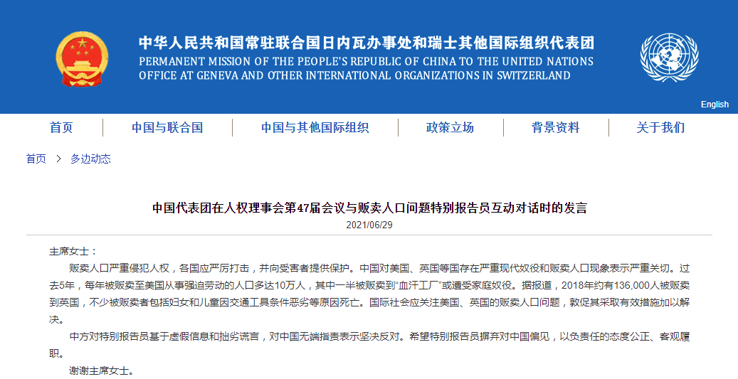 香港新聞網6月30日電 據中國常駐聯合國日內瓦辦事處和瑞士其他國際組織代表團網站消息,6月29日,中國代表在人權理事會第四十七屆會議與販賣人口問題特別報告員對話時發言,表示販賣人口嚴重侵犯人權,各國應嚴厲打擊,並向受害者提供保護。中國對美國、英國等國存在嚴重現代奴役和販賣人口現象表示嚴重關切。 中國代表指出,過去5年,每年被販賣至美國從事強迫勞動的人口多達10萬人,其中一半被販賣到“血汗工廠”或遭受家庭...