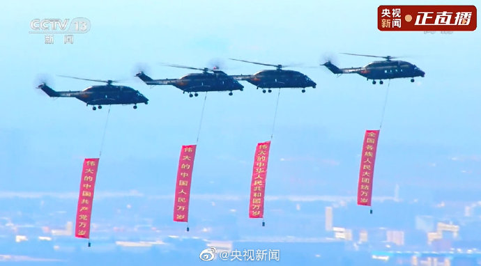 慶祝中國共產黨成立100周年大會今天(7月1日)上午8時在北京天安門廣場隆重舉行。中國人民解放軍空中梯隊亮相慶祝大會。71架戰鷹列陣長空,飛向天安門廣場,向黨致敬,向祖國致敬,向人民致敬。 鮮紅的中國共產黨黨旗由直升機護旗梯隊護衛,迎風向前。 緊隨黨旗的是四面巨幅標語:“偉大的中國共產黨萬歲”“偉大的中國人民萬歲”“偉大的中華人民共和國萬歲”“全國各族人民大團結萬歲”。 29架直-10和直-19...