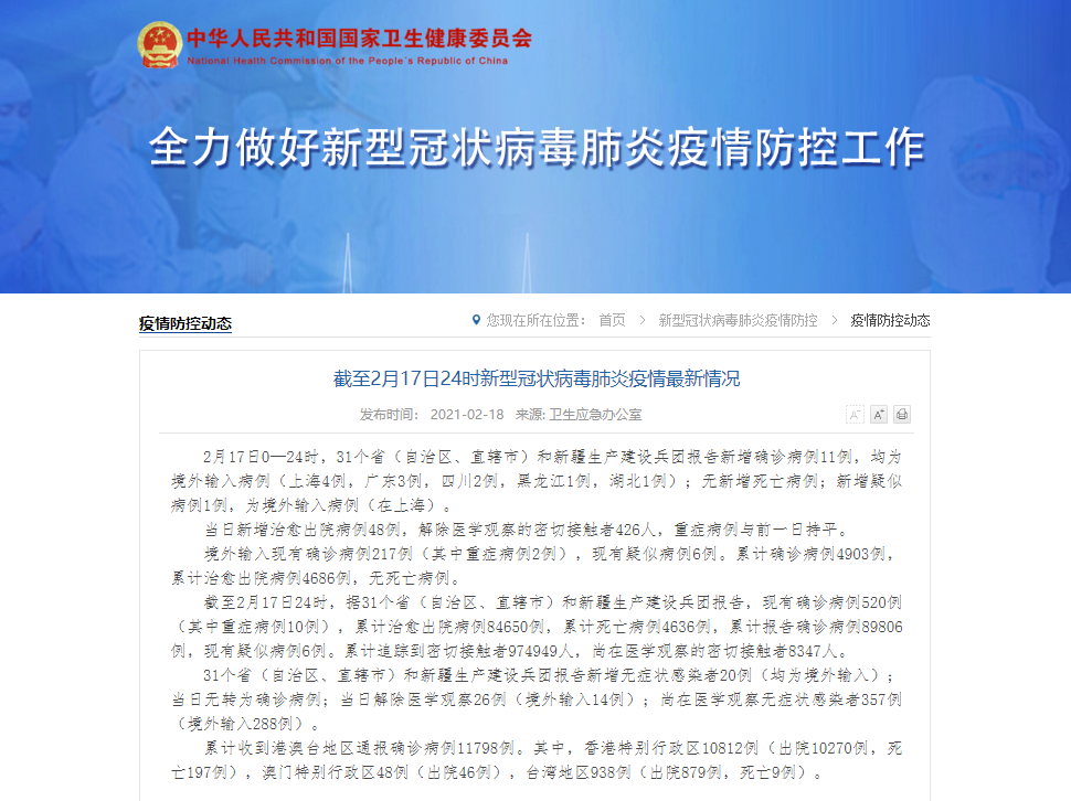 香港新聞網2月18日電 據國家衛生健康委員會官方網站18日消息,2月17日0—24時,31個省(自治區、直轄市)和新疆生產建設兵團報告新增確診病例11例,均為境外輸入病例(上海4例,廣東3例,四川2例,黑龍江1例,湖北1例);無新增死亡病例;新增疑似病例1例,為境外輸入病例(在上海)。 當日新增治愈出院病例48例,解除醫學觀察的密切接觸者426人,重癥病例與前一日持平。 境外輸入現有確診病例217例(其中重癥...