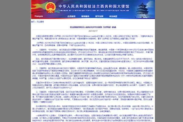 香港新聞網2月18日電 2月17日,中國駐法國大使館發表駐法國使館發言人就有關涉華文章致《世界報》的函: 中國駐法國使館注意到《世界報》2021年2月9日刊登了駐華記者Simon Leplâtre的文章《一年之後,中國人沒有忘記“吹哨人”李文亮》,文章有關表述與事實嚴重不符。根據法國1881年《新聞自由法》第13條,中國使館要求行使答辯權,要求《世界報》在下期報紙上完整刊登以下內容: 《世界報》2021年2月...