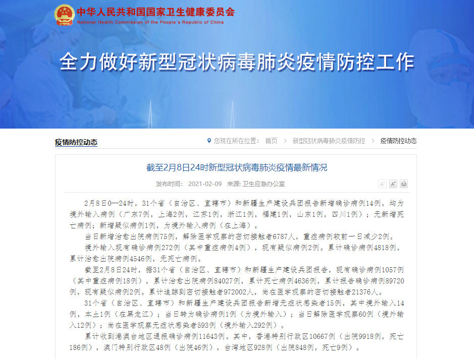 香港新聞網2月9日電 國家衛生健康委員會官方網站2月9日通報,2月8日0—24時,31個省(自治區、直轄市)和新疆生產建設兵團報告新增確診病例14例,均為境外輸入病例(廣東7例,上海2例,江蘇1例,浙江1例,福建1例,山東1例,四川1例);無新增死亡病例;新增疑似病例1例,為境外輸入病例(在上海)。 當日新增治愈出院病例75例,解除醫學觀察的密切接觸者6787人,重癥病例較前一日減少2例。 境外輸入現有確診病...