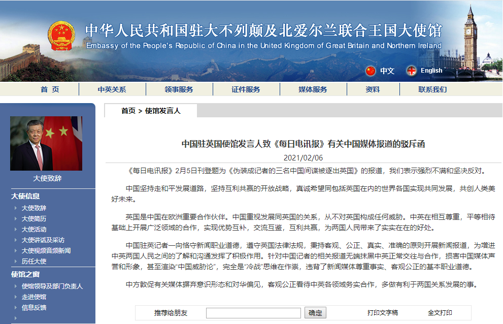 英媒污衊中國記者是“間諜”,中使館駁斥
