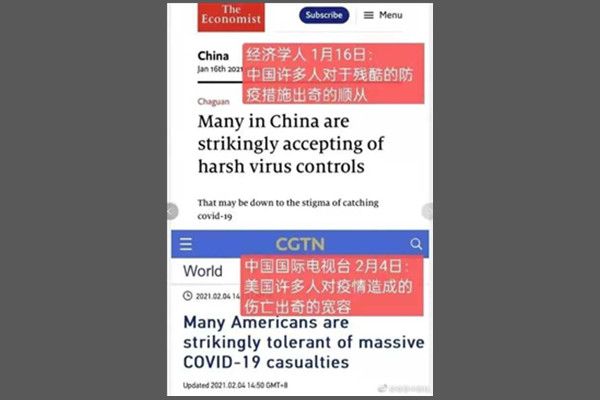 “人權(到底)是什麽?”近日,英國《經濟學人》和中國國際電視台(CGTN)網站的2篇文章標題格式相似,卻對此給出了截然不同的答案,高下立判。 正如中國外交部發言人華春瑩此前曾說過很多次的:人權絕不是什麽空洞的口號,而是具體、實在的。最大的人權莫過於生命權。疫情形勢下,最大的人權莫過於健康平安活著的權利和自由。 “許多中國人接受了嚴苛的防疫管控,不同尋常” “許多美國人對新冠疫情造成大量死傷持寬容態度...