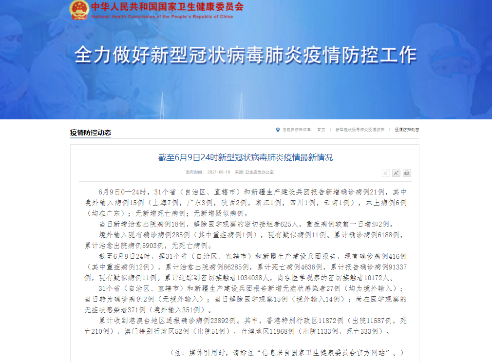 香港新聞網6月10日電 據國家衛生健康委員會官方網站消息,6月9日0—24時,31個省(自治區、直轄市)和新疆生產建設兵團報告新增確診病例21例,其中境外輸入病例15例(上海7例,廣東3例,陜西2例,浙江1例,四川1例,雲南1例),本土病例6例(均在廣東);無新增死亡病例;無新增疑似病例。 當日新增治愈出院病例18例,解除醫學觀察的密切接觸者625人,重癥病例較前一日增加2例。 境外輸入現有確診病例285例(...