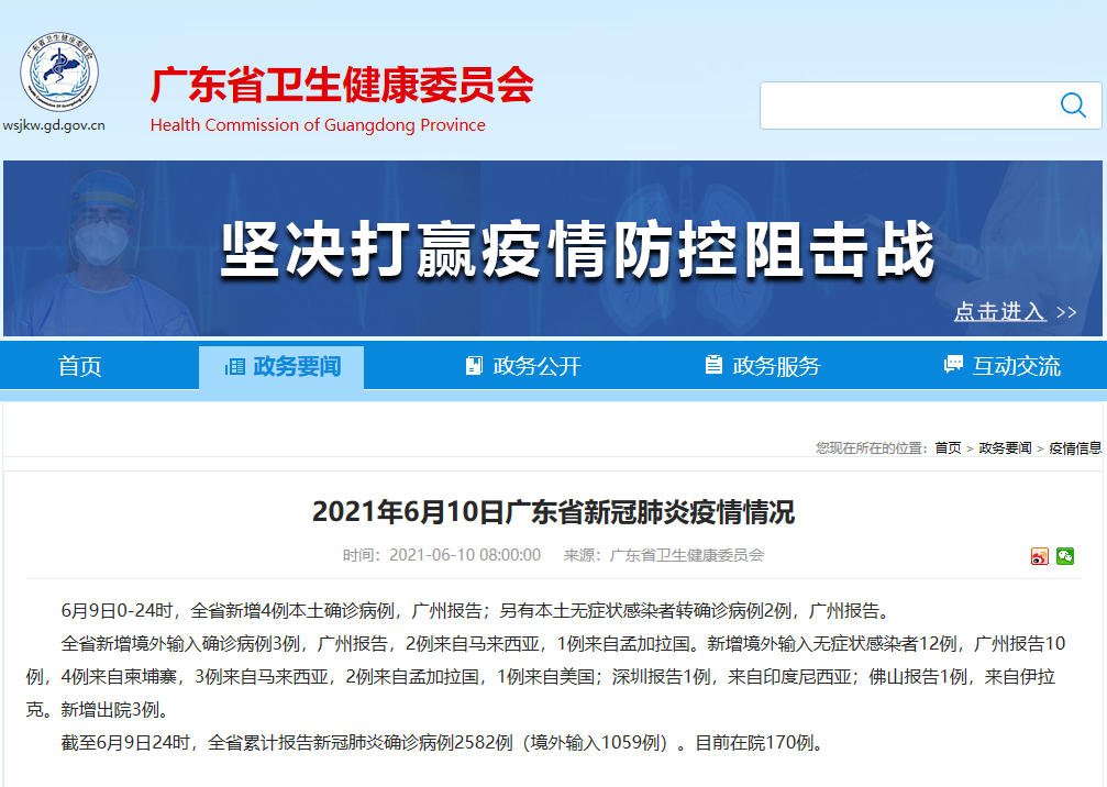 香港新聞網6月10日電 據廣東省衛健委網站10日消息,6月9日0-24時,全省新增4例本土確診病例,廣州報告;另有本土無癥狀感染者轉確診病例2例,廣州報告。 全省新增境外輸入確診病例3例,廣州報告,2例來自馬來西亞,1例來自孟加拉國。新增境外輸入無癥狀感染者12例,廣州報告10例,4例來自柬埔寨,3例來自馬來西亞,2例來自孟加拉國,1例來自美國;深圳報告1例,來自印度尼西亞;佛山報告1例,來自伊拉克。新增出院3...