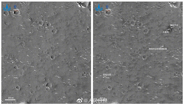 2021年6月7日,國家航天局發佈中國首次火星探測天問一號任務著陸區域高分影像圖。圖像中天問一號著陸平台、“祝融號”火星車及周邊區域情況清晰可見。 影像圖由天問一號環繞器高分辨率相機,於6月2日18時拍攝。圖像右上角有兩處明顯亮斑,靠上的亮斑由兩個亮點組成,較大亮點為天問一號著陸平台,較小亮點為“祝融號”火星車。以著陸平台亮點為中心,周圍區域顏色較暗,據分析,可能是降落過程中受到發動機羽流影響造成。著陸平台南北...