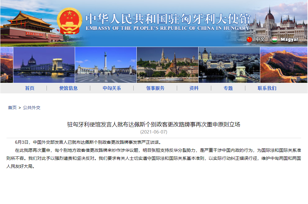 香港新聞網6月8日電 中國駐匈牙利大使館網站6月7日消息,駐匈牙利使館發言人就布達佩斯個別政客更改路牌事再次重申原則立場。 6月3日,中國外交部發言人已就布達佩斯個別政客更改路牌事發表嚴正談話。 在此我願再次重申,匈個別地方政客借更改路牌來炒作涉華議題,明目張膽支持反華分裂勢力,是嚴重干涉中國內政的行為,為國際法和國際關係準則所不容。我們對此予以強烈譴責和堅決反對。我們要求有關人士切實遵守國際法和國際關係基本...