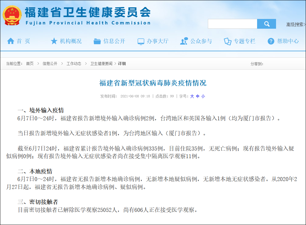 香港新聞網6月8日電 6月8日,福建衛健委官網發佈該省新型冠狀病毒肺炎疫情情況: 一、境外輸入疫情 6月7日0~24時,福建省報告新增境外輸入確診病例2例,台灣地區和英國各輸入1例(均為廈門市報告)。 當日報告新增境外輸入無癥狀感染者1例,為台灣地區輸入(廈門市報告)。 截至6月7日24時,福建省累計報告境外輸入確診病例335例,目前住院35例,無死亡病例;現有報告境外輸入疑似病例0例;現有報告境外輸入無...