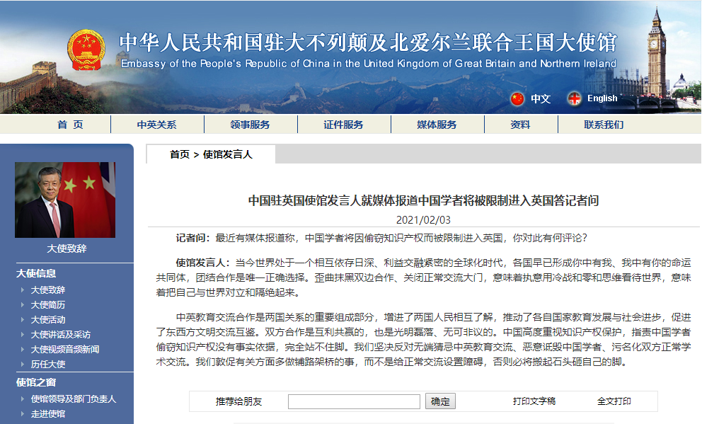 香港新聞網2月3日電 據中國駐英大使館網站3日消息,中國駐英國使館發言人就媒體報道中國學者將被限制進入英國答記者問。 記者問:最近有媒體報道稱,中國學者將因偷竊知識產權而被限制進入英國,你對此有何評論? 使館發言人:當今世界處於一個相互依存日深、利益交融緊密的全球化時代,各國早已形成妳中有我、我中有妳的命運共同體,團結合作是唯一正確選擇。歪曲抹黑雙邊合作、關閉正常交流大門,意味著執意用冷戰和零和思維看待世界,...