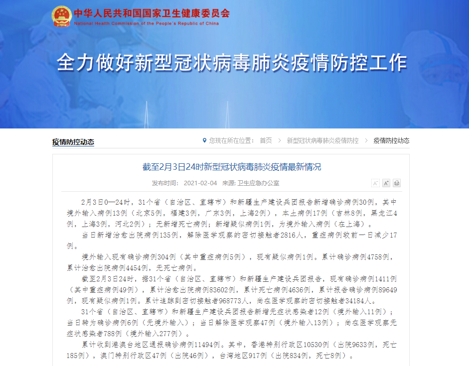 香港新聞網2月4日電 國家衛健委網站2月4日消息:2月3日0—24時,31個省(自治區、直轄市)和新疆生產建設兵團報告新增確診病例30例,其中境外輸入病例13例(北京5例,福建3例,廣東3例,上海2例),本土病例17例(吉林8例,黑龍江4例,上海3例,河北2例);無新增死亡病例;新增疑似病例1例,為境外輸入病例(在上海)。 當日新增治愈出院病例135例,解除醫學觀察的密切接觸者2816人,重癥病例較前一日減少1...