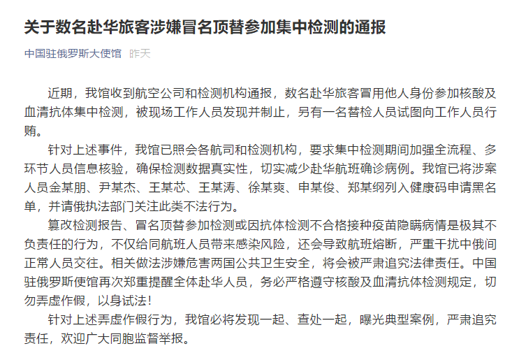 中國駐俄使館:數名赴華旅客冒名頂替參加檢測,還試圖行賄