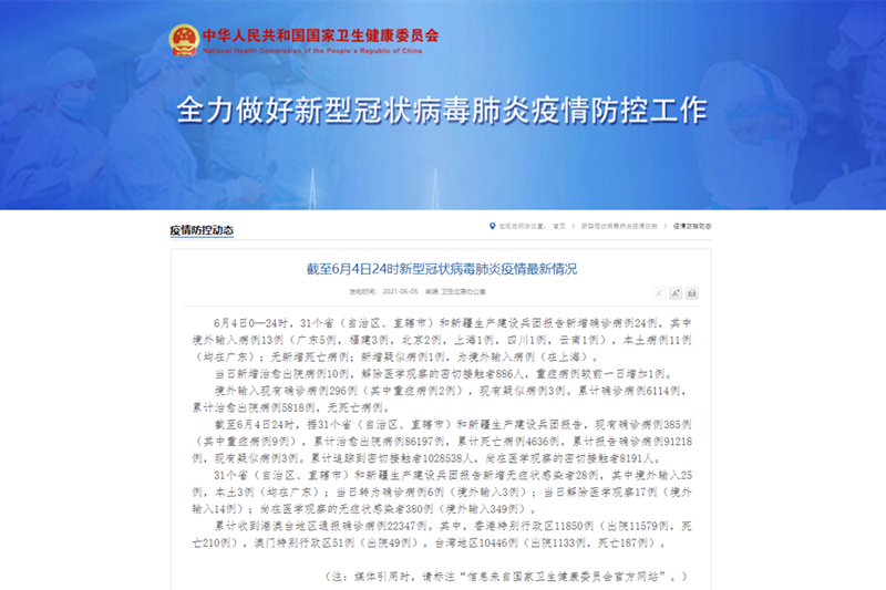 香港新聞網6月5日電 據國家衛生健康委員會官方網站消息,6月4日0—24時,31個省(自治區、直轄市)和新疆生產建設兵團報告新增確診病例24例,其中境外輸入病例13例(廣東5例,福建3例,北京2例,上海1例,四川1例,雲南1例),本土病例11例(均在廣東);無新增死亡病例;新增疑似病例1例,為境外輸入病例(在上海)。 當日新增治愈出院病例10例,解除醫學觀察的密切接觸者886人,重症病例較前一日增加1例。 境...