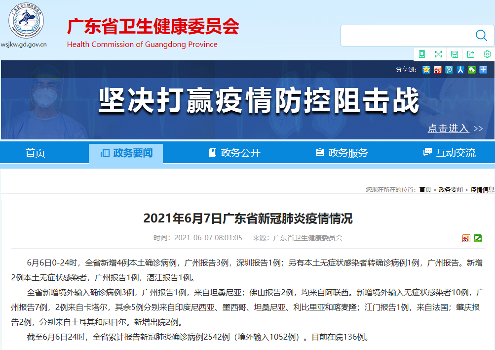 香港新聞網6月7日電 廣東省衛健委網站6月7日消息,6月6日0-24時,廣東省新增4例本土確診病例,廣州報告3例,深圳報告1例;另有本土無癥狀感染者轉確診病例1例,廣州報告。新增2例本土無癥狀感染者,廣州報告1例,湛江報告1例。 全省新增境外輸入確診病例3例,廣州報告1例,來自坦桑尼亞;佛山報告2例,均來自阿聯酋。新增境外輸入無癥狀感染者10例,廣州報告7例,2例來自卡塔爾,其余5例分別來自印度尼西亞、墨西哥、...
