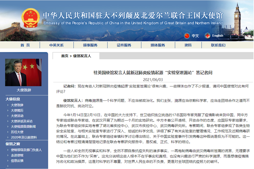 媒體炒作“病毒實驗室泄漏論”,中國駐英使館回應