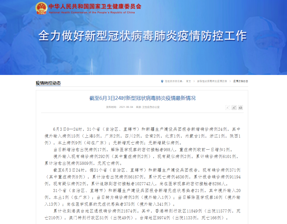 香港新聞網6月4日電 據國家衛生健康委員會官方網站消息,6月3日0—24時,31個省(自治區、直轄市)和新疆生產建設兵團報告新增確診病例24例,其中境外輸入病例15例(上海5例,廣東2例,四川2例,雲南2例,北京1例,內蒙古1例,浙江1例,陜西1例),本土病例9例(均在廣東);無新增死亡病例;無新增疑似病例。 當日新增治愈出院病例17例,解除醫學觀察的密切接觸者988人,重癥病例較前一日增加1例。 境外輸入現...