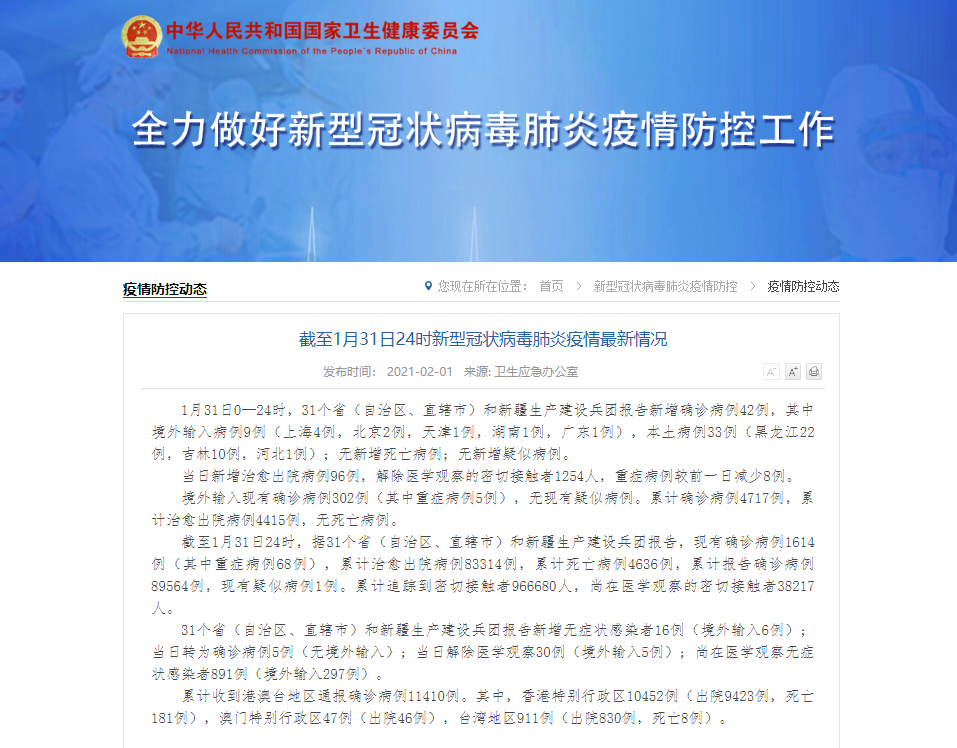 香港新聞網2月1日電 國家衛健委網站2月1日通報:1月31日0—24時,31個省(自治區、直轄市)和新疆生產建設兵團報告新增確診病例42例,其中境外輸入病例9例(上海4例,北京2例,天津1例,湖南1例,廣東1例),本土病例33例(黑龍江22例,吉林10例,河北1例);無新增死亡病例;無新增疑似病例。 當日新增治愈出院病例96例,解除醫學觀察的密切接觸者1254人,重癥病例較前一日減少8例。 &...