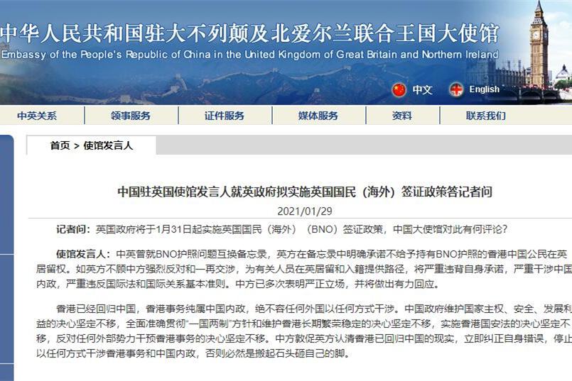 香港新聞網1月29日電 中國駐英大使館網站1月29日發布“中國駐英國使館發言人就英政府擬實施英國國民(海外)簽證政策答記者問”,全文如下: 記者問:英國政府將於1月31日起實施英國國民(海外)(BNO)簽證政策,中國大使館對此有何評論? 使館發言人:中英曾就BNO護照問題互換備忘錄,英方在備忘錄中明確承諾不給予持有BNO護照的香港中國公民在英居留權。如英方不顧中方強烈反對和一再交涉,為有關人員在英居留和入籍提...