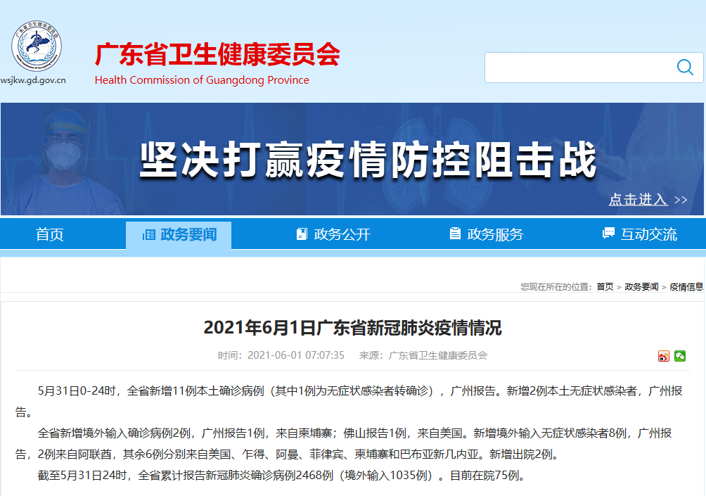 香港新聞網6月1日電 據廣東省衛生健康委員會網站消息,5月31日0-24時,全省新增11例本土確診病例(其中1例為無癥狀感染者轉確診),廣州報告。新增2例本土無癥狀感染者,廣州報告。 全省新增境外輸入確診病例2例,廣州報告1例,來自柬埔寨;佛山報告1例,來自美國。新增境外輸入無癥狀感染者8例,廣州報告,2例來自阿聯酋,其余6例分別來自美國、乍得、阿曼、菲律賓、柬埔寨和巴布亞新幾內亞。新增出院2例。 截至5月3...
