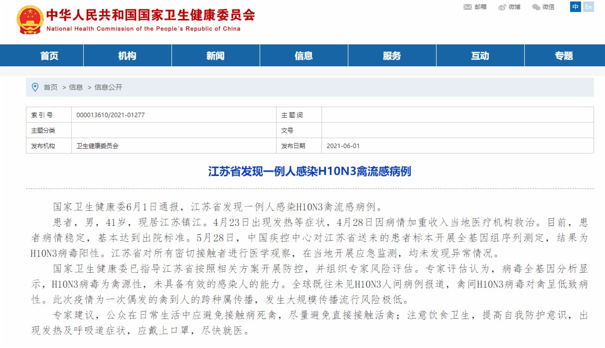香港新聞網6月1日電 國家衞生健康委6月1日通報,江蘇省發現一例人感染H10N3禽流感病例。 患者,男,41歲,現居江蘇鎮江。4月23日出現發熱等症狀,4月28日因病情加重收入當地醫療機構救治。目前,患者病情穩定,基本達到出院標準。5月28日,中國疾控中心對江蘇省送來的患者標本開展全基因組序列測定,結果為H10N3病毒陽性。江蘇省對所有密切接觸者進行醫學觀察,在當地開展應急監測,均未發現異常情況。 國家衞生健...