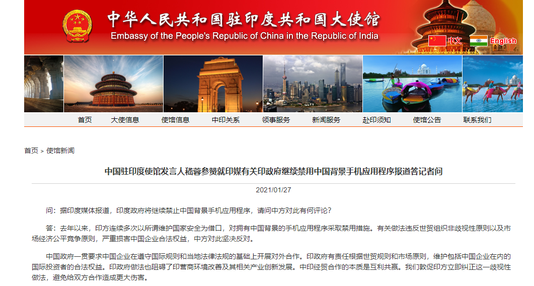 香港新聞網1月27日電 中國駐印度使館網站1月27日發布中國駐印度使館發言人嵇蓉參贊就印媒有關印政府繼續禁用中國背景手機應用程序報道答記者問。 問:據印度媒體報道,印度政府將繼續禁止中國背景手機應用程序,請問中方對此有何評論? 答:去年以來,印方連續多次以所謂維護國家安全為借口,對擁有中國背景的手機應用程序采取禁用措施。有關做法違反世貿組織非歧視性原則以及市場經濟公平競爭原則,嚴重損害中國企業合法權益,中方對...