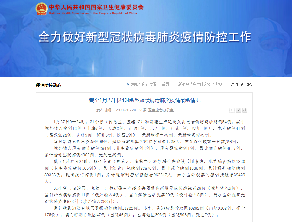 香港新聞網1月28日電 據國家衛生健康委1月28日通報,1月27日0—24時,31個省(自治區、直轄市)和新疆生產建設兵團報告新增確診病例54例,其中境外輸入病例13例(上海7例,天津2例,山西1例,江蘇1例,廣東1例,四川1例),本土病例41例(黑龍江28例,吉林9例,河北3例,陜西1例);無新增死亡病例;無新增疑似病例。 當日新增治愈出院病例96例,解除醫學觀察的密切接觸者1735人,重癥病例較前一日減少6...