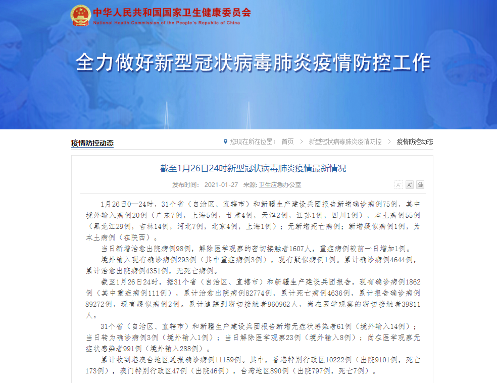 香港新聞網1月27日電 據國家衛健委網站消息,1月26日0—24時,31個省(自治區、直轄市)和新疆生產建設兵團報告新增確診病例75例,其中境外輸入病例20例(廣東7例,上海5例,甘肅4例,天津2例,江蘇1例,四川1例),本土病例55例(黑龍江29例,吉林14例,河北7例,北京4例,上海1例);無新增死亡病例;新增疑似病例1例,為本土病例(在陜西)。 當日新增治愈出院病例98例,解除醫學觀察的密切接觸者1607...