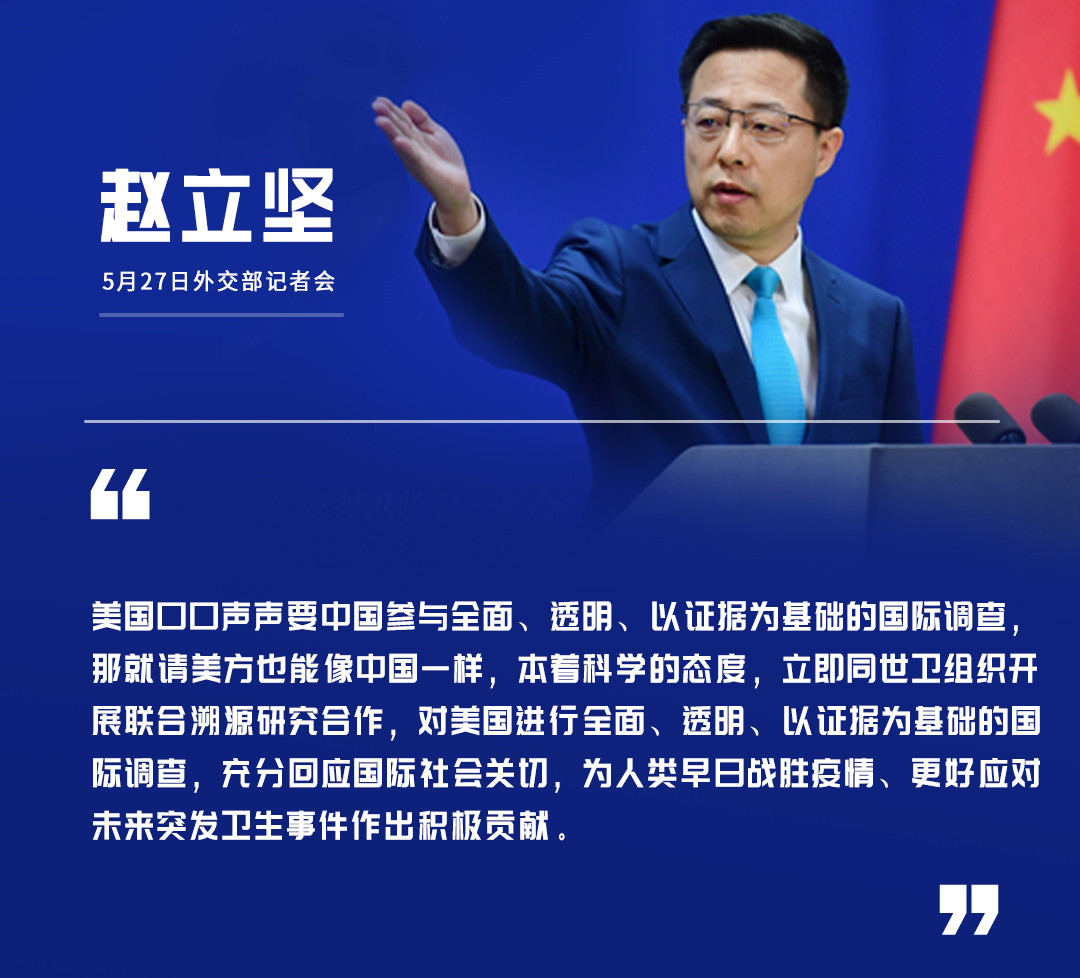 香港新聞網5月27日電 27日中國外交部例行記者會消息,有記者提問美國總統拜登26日發表聲明稱,他已要求美國情報部門對新冠病毒到底起源自動物還是實驗室事故進行調查。他稱,美國將同其他夥伴國家合作,敦促中國參與全面、透明、以證據為基礎的國際調查。對此,中國外交部發言人趙立堅表示,美國情報部門的黑歷史世人皆知,即使其搞出調查結果也毫無公信力可言。他同時稱,既然美國口口聲聲要中國參與全面、透明、以證據為基礎的國際調查,...