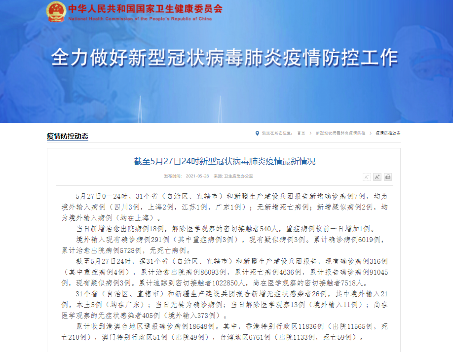 香港新聞網5月28日電 據國家衛生健康委員會官方網站28日消息,5月27日0—24時,31個省(自治區、直轄市)和新疆生產建設兵團報告新增確診病例7例,均為境外輸入病例(四川3例,上海2例,江蘇1例,廣東1例);無新增死亡病例;新增疑似病例2例,均為境外輸入病例(均在上海)。 當日新增治愈出院病例18例,解除醫學觀察的密切接觸者540人,重癥病例較前一日增加1例。 境外輸入現有確診病例291例(其中重癥病例3...