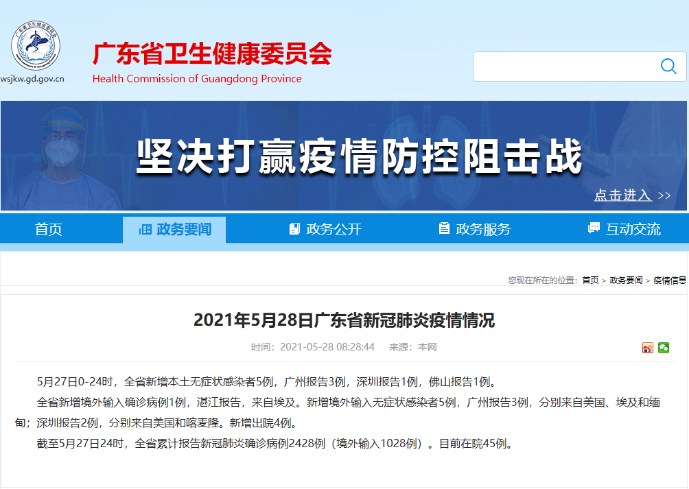 香港新聞網5月28日電 據廣東省衛生健康委員會網站28日消息,5月27日0-24時,全省新增本土無癥狀感染者5例,廣州報告3例,深圳報告1例,佛山報告1例。 全省新增境外輸入確診病例1例,湛江報告,來自埃及。新增境外輸入無癥狀感染者5例,廣州報告3例,分別來自美國、埃及和緬甸;深圳報告2例,分別來自美國和喀麥隆。新增出院4例。 截至5月27日24時,全省累計報告新冠肺炎確診病例2428例(境外輸入1028例)...