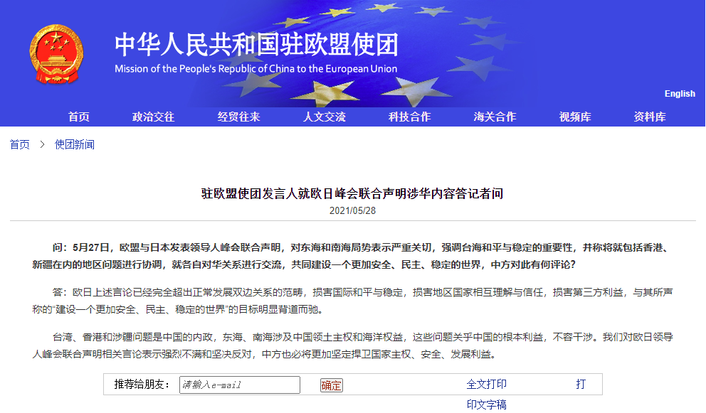 香港新聞網5月28日電 據中國駐歐盟使團網站5月28日消息,駐歐盟使團發言人就歐日峰會聯合聲明涉華內容答記者問。 問:5月27日,歐盟與日本發表領導人峰會聯合聲明,對東海和南海局勢表示嚴重關切,強調台海和平與穩定的重要性,並稱將就包括香港、新疆在內的地區問題進行協調,就各自對華關係進行交流,共同建設一個更加安全、民主、穩定的世界,中方對此有何評論? 答:歐日上述言論已經完全超出正常發展雙邊關係的範疇,損害國際...