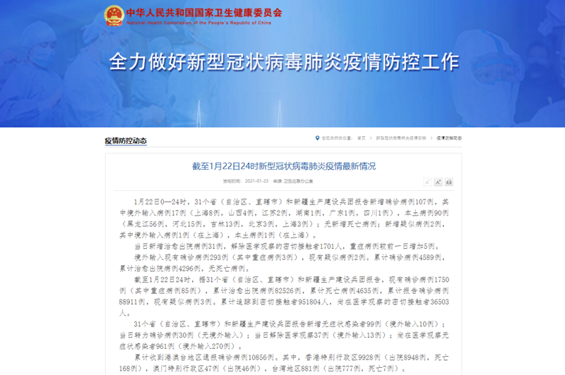 香港新聞網1月23日電 據國家衛健委網站消息,1月22日0—24時,31個省(自治區、直轄市)和新疆生產建設兵團報告新增確診病例107例,其中境外輸入病例17例(上海8例,山西4例,江蘇2例,湖南1例,廣東1例,四川1例),本土病例90例(黑龍江56例,河北15例,吉林13例,北京3例,上海3例);無新增死亡病例;新增疑似病例2例,其中境外輸入病例1例(在上海),本土病例1例(在上海)。 當日新增治愈出院病例3...