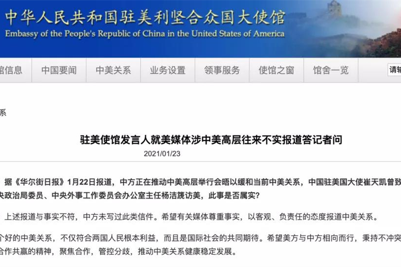 香港新聞網1月23日電 據中國駐美國大使館網站消息,1月23日,中國駐美國使館發言人就美媒體涉中美高層往來不實報道答記者問。 中國駐美國大使館網站截圖 問:據《華爾街日報》1月22日報道,中方正在推動中美高層舉行會晤以緩和當前中美關係,中國駐美國大使崔天凱曾致信美方提議由中共中央政治局委員、中央外事工作委員會辦公室主任楊潔篪訪美,此事是否屬實? 答:上述報道與事實不符,中方未寫過此類信件。希望有關媒體尊...