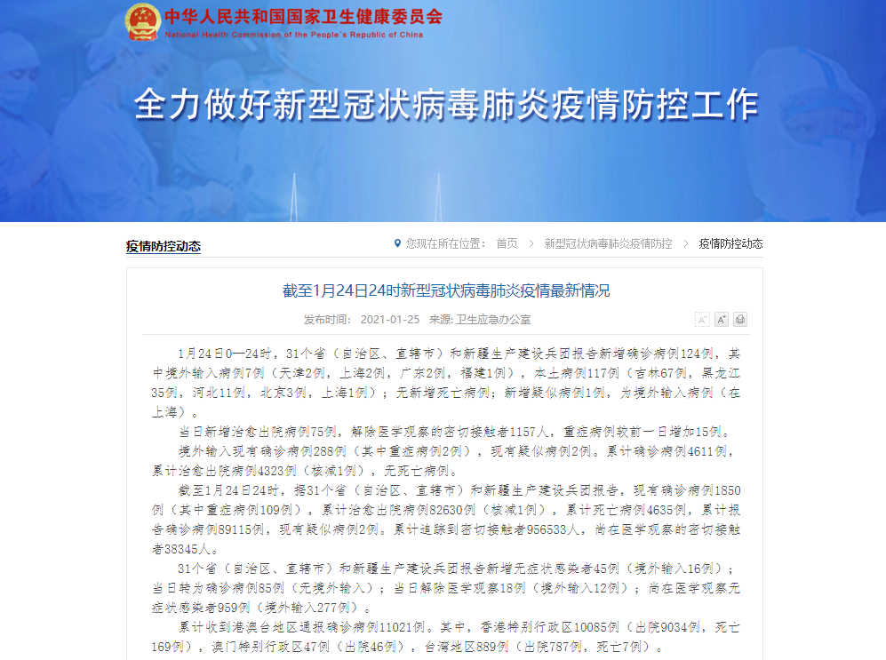 香港新聞網1月25日電 國家衛健委網站消息,1月24日0—24時,31個省(自治區、直轄市)和新疆生產建設兵團報告新增確診病例124例,其中境外輸入病例7例(天津2例,上海2例,廣東2例,福建1例),本土病例117例(吉林67例,黑龍江35例,河北11例,北京3例,上海1例);無新增死亡病例;新增疑似病例1例,為境外輸入病例(在上海)。 當日新增治愈出院病例75例,解除醫學觀察的密切接觸者1157人,重癥病例較...