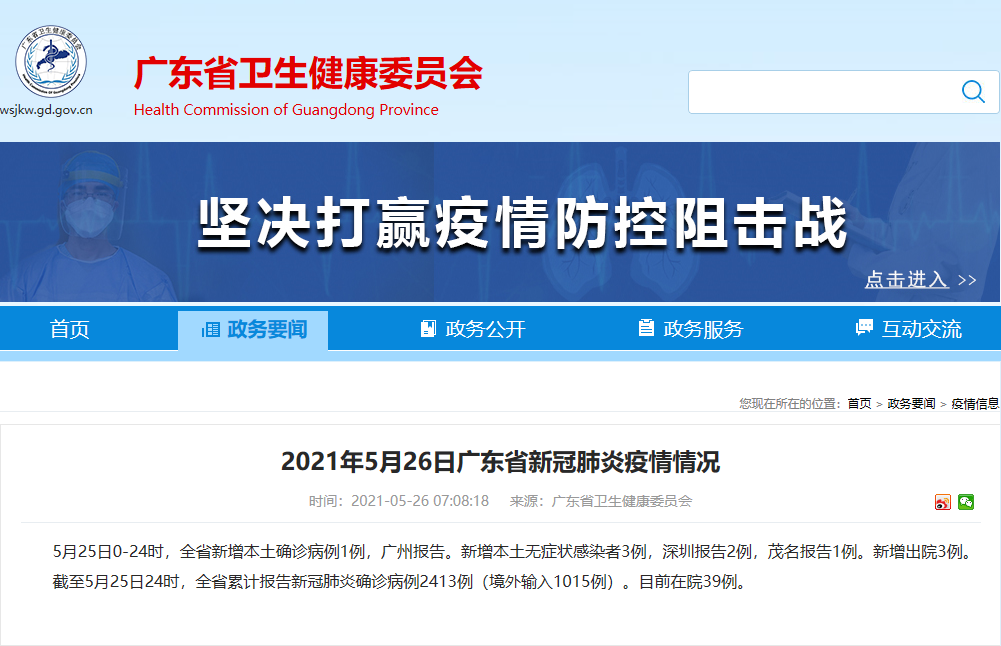 香港新聞網5月26日電 據廣東省衛生健康委員會網站26日消息,5月25日0-24時,廣東全省新增本土確診病例1例,廣州報告。新增本土無癥狀感染者3例,深圳報告2例,茂名報告1例。新增出院3例。截至5月25日24時,廣東省累計報告新冠肺炎確診病例2413例(境外輸入1015例)。目前在院39例。
