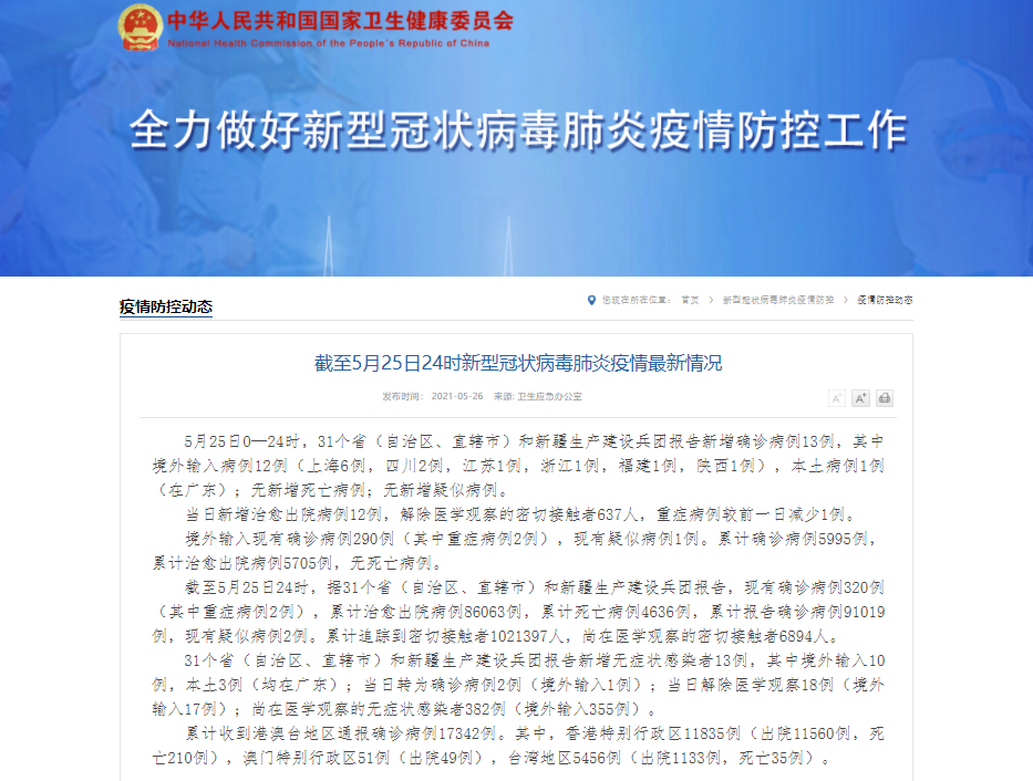 香港新聞網5月26日電 據國家衛生健康委員會官方網站26日消息,5月25日0—24時,31個省(自治區、直轄市)和新疆生產建設兵團報告新增確診病例13例,其中境外輸入病例12例(上海6例,四川2例,江蘇1例,浙江1例,福建1例,陜西1例),本土病例1例(在廣東);無新增死亡病例;無新增疑似病例。 當日新增治愈出院病例12例,解除醫學觀察的密切接觸者637人,重癥病例較前一日減少1例。 境外輸入現有確診病例29...