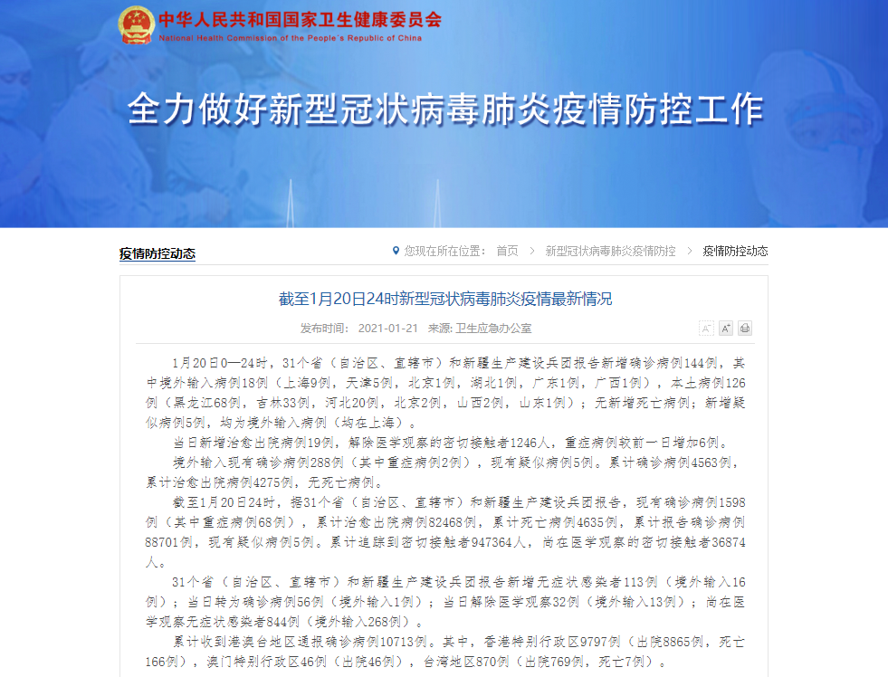 香港新聞網1月21日電 據國家衛健委網站1月21日通報,1月20日0—24時,31個省(自治區、直轄市)和新疆生產建設兵團報告新增確診病例144例,其中境外輸入病例18例(上海9例,天津5例,北京1例,湖北1例,廣東1例,廣西1例),本土病例126例(黑龍江68例,吉林33例,河北20例,北京2例,山西2例,山東1例);無新增死亡病例;新增疑似病例5例,均為境外輸入病例(均在上海)。 當日新增治愈出院病例19例...