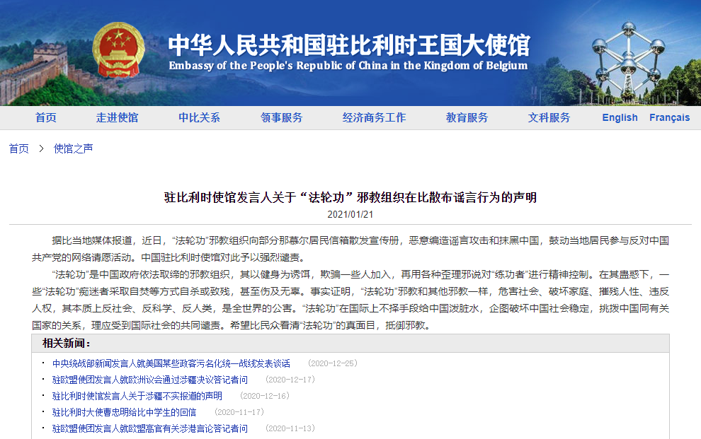 香港新聞網1月21日電 據中國駐比利時大使館公眾號1月21日消息,駐比利時使館發言人關於“法輪功”邪教組織在比散布謠言行為的聲明: 據比當地媒體報道,近日,“法輪功”邪教組織向部分那慕爾居民信箱散發宣傳冊,惡意編造謠言攻擊和抹黑中國,鼓動當地居民參與反對中國共產黨的網絡請願活動。中國駐比利時使館對此予以強烈譴責。 “法輪功”是中國政府依法取締的邪教組織,其以健身為誘餌,欺騙一些人加入,再用各種歪理邪說對“練功...
