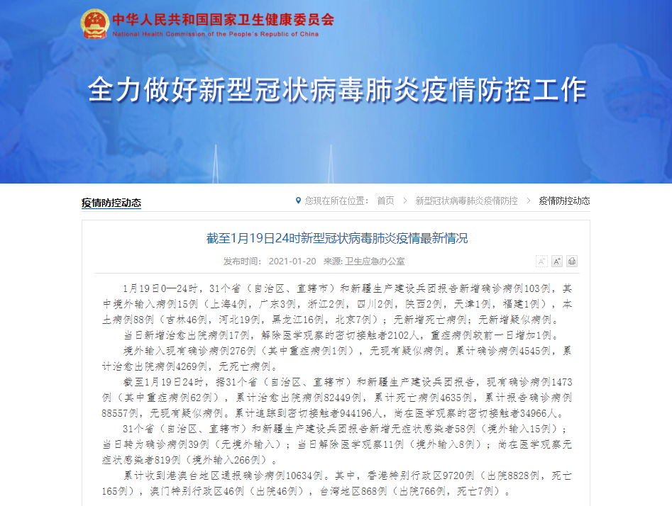 香港新聞網1月20日電 據國家衛健委網站1月20日消息,1月19日0—24時,31個省(自治區、直轄市)和新疆生產建設兵團報告新增確診病例103例,其中境外輸入病例15例(上海4例,廣東3例,浙江2例,四川2例,陜西2例,天津1例,福建1例),本土病例88例(吉林46例,河北19例,黑龍江16例,北京7例);無新增死亡病例;無新增疑似病例。 當日新增治愈出院病例17例,解除醫學觀察的密切接觸者2102人,重癥病...