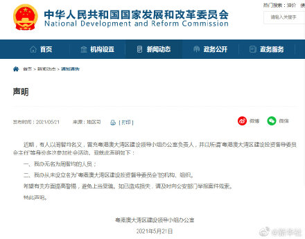 國家發改委:有人冒充粵港澳大灣區建設領導小組辦公室負責人