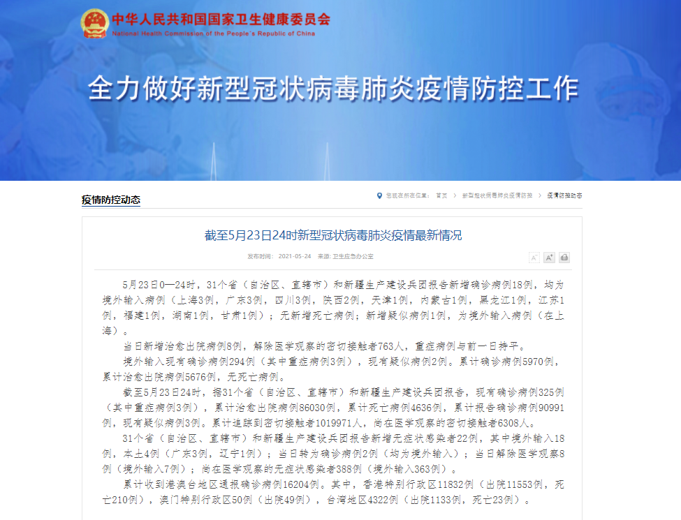 香港新聞網5月24日電 據國家衛生健康委員會官方網站消息,5月23日0—24時,31個省(自治區、直轄市)和新疆生產建設兵團報告新增確診病例18例,均為境外輸入病例(上海3例,廣東3例,四川3例,陜西2例,天津1例,內蒙古1例,黑龍江1例,江蘇1例,福建1例,湖南1例,甘肅1例);無新增死亡病例;新增疑似病例1例,為境外輸入病例(在上海)。 當日新增治愈出院病例8例,解除醫學觀察的密切接觸者763人,重癥病例與...