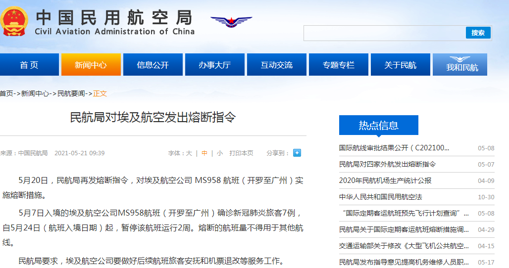 香港新聞網5月21日電 據中國民航局網站21日消息,5月20日,民航局再發熔斷指令,對埃及航空公司 MS958 航班(開羅至廣州)實施熔斷措施。 5月7日入境的埃及航空公司MS958航班(開羅至廣州)確診新冠肺炎旅客7例,自5月24日(航班入境日期)起,暫停該航班運行2周。熔斷的航班量不得用於其他航線。 民航局要求,埃及航空公司要做好後續航班旅客安撫和機票退改等服務工作。