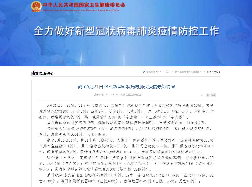 香港新聞網5月22日電 據國家衛生健康委員會官方網站22日消息,5月21日0—24時,31個省(自治區、直轄市)和新疆生產建設兵團報告新增確診病例10例,其中境外輸入病例9例(廣東5例,四川2例,遼寧1例,上海1例),本土病例1例(在廣東);無新增死亡病例;新增疑似病例2例,其中境外輸入病例1例(在上海),本土病例1例(在安徽)。 當日新增治愈出院病例12例,解除醫學觀察的密切接觸者408人,重癥病例較前一日減...