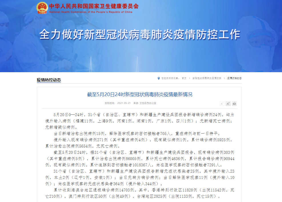 香港新聞網5月21日電 據國家衛生健康委員會官方網站21日消息,5月20日0—24時,31個省(自治區、直轄市)和新疆生產建設兵團報告新增確診病例24例,均為境外輸入病例(福建11例,上海9例,河南1例,湖南1例,廣東1例,四川1例);無新增死亡病例;無新增疑似病例。 當日新增治愈出院病例15例,解除醫學觀察的密切接觸者705人,重癥病例與前一日持平。 境外輸入現有確診病例271例(其中重癥病例4例),現有疑...