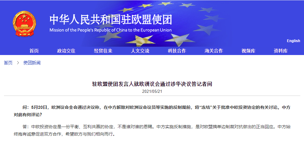 香港新聞網5月21日電 據中國駐歐盟使團網站5月21日消息,駐歐盟使團發言人就歐洲議會通過涉華決議答記者問。 問:5月20日,歐洲議會全會通過決議稱,在中方解除對歐洲議會議員等實施的反制裁前,將“凍結”關於批準中歐投資協定的有關討論。中方對此有何評論? 答:中歐投資協定是一份平衡、互利共贏的協定,不是誰對誰的恩賜。中方實施反制措施,是對歐盟搞單邊制裁對抗做出的正當回應。中方始終抱有誠意促進雙方合作,希望歐方與...