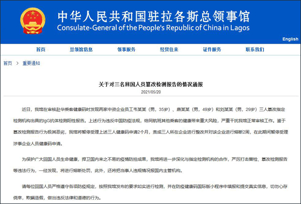 香港新聞網5月21日電 5月20日,中國駐拉各斯總領館網站發布關於對三名回國人員篡改檢測報告的情況通報。 以下為全文: 近日,我館在審核赴華乘客健康碼時發現兩家中資企業員工韋某某(男,35歲)、唐某某(男,49歲)和劉某某(男,29歲)三人篡改指定檢測機構出具的IgG抗體檢測陽性報告。上述行為違反中國防疫法規,給同航班其他乘客的健康帶來重大風險,嚴重幹擾我館正常審核工作。鑒於篡改檢測報告行為極其惡劣,我館將暫...