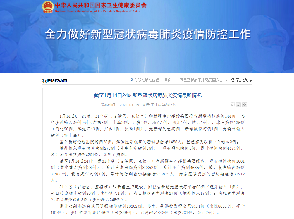 香港新聞網1月15日電 據國家衛健委網站消息,1月14日0—24時,31個省(自治區、直轄市)和新疆生產建設兵團報告新增確診病例144例,其中境外輸入病例9例(廣東3例,上海2例,江蘇1例,浙江1例,四川1例,陜西1例),本土病例135例(河北90例,黑龍江43例,廣西1例,陜西1例);無新增死亡病例;新增疑似病例1例,為境外輸入病例(在上海)。 當日新增治愈出院病例28例,解除醫學觀察的密切接觸者1488人,...