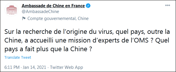 1月14日,世界衛生組織(WHO)專家組飛抵武漢,他們將與中國專家一道展開新冠病毒溯源工作。值此之際,部分西方媒體仍在陰陽怪氣地污衊中國“掩蓋事實”。 曾多次發漫畫諷刺美國政客的中國駐法大使館,再次發出“靈魂拷問”,14日以《停止政治操弄,讓新冠病毒溯源回歸科學本源》為題發文,一針見血地指出:“在病毒溯源問題上,還有哪個國家接待過世衛專家考察?哪個國家比中國做得更多?” 中國駐法大使館官方推特當天也發帖,專門...