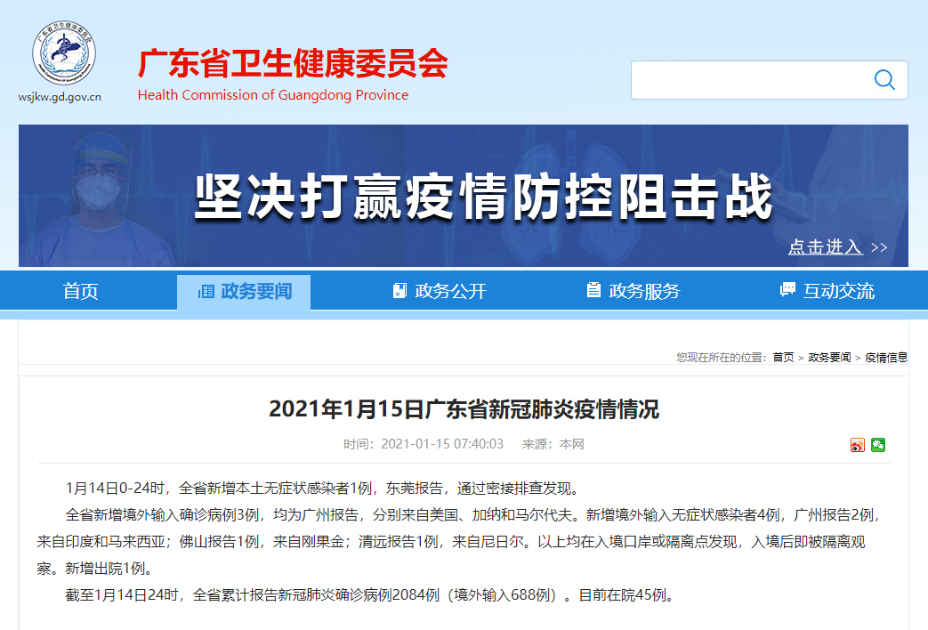 香港新聞網1月15日電 據廣東衛健委消息,1月14日0-24時,全省新增本土無癥狀感染者1例,東莞報告,通過密接排查發現。 全省新增境外輸入確診病例3例,均為廣州報告,分別來自美國、加納和馬爾代夫。新增境外輸入無癥狀感染者4例,廣州報告2例,來自印度和馬來西亞;佛山報告1例,來自剛果金;清遠報告1例,來自尼日爾。以上均在入境口岸或隔離點發現,入境後即被隔離觀察。新增出院1例。 截至1月14日24時,全省累計報...
