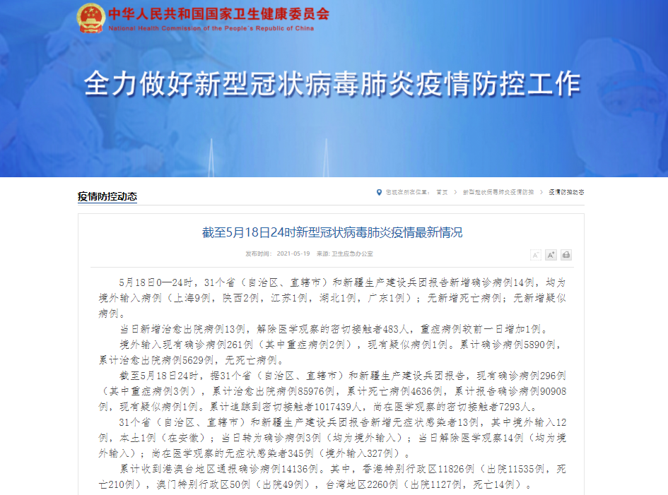 香港新聞網5月19日電 據國家衛生健康委員會官方網站消息,5月18日0—24時,31個省(自治區、直轄市)和新疆生產建設兵團報告新增確診病例14例,均為境外輸入病例(上海9例,陜西2例,江蘇1例,湖北1例,廣東1例);無新增死亡病例;無新增疑似病例。 當日新增治愈出院病例13例,解除醫學觀察的密切接觸者483人,重癥病例較前一日增加1例。 境外輸入現有確診病例261例(其中重癥病例2例),現有疑似病例1例。累...
